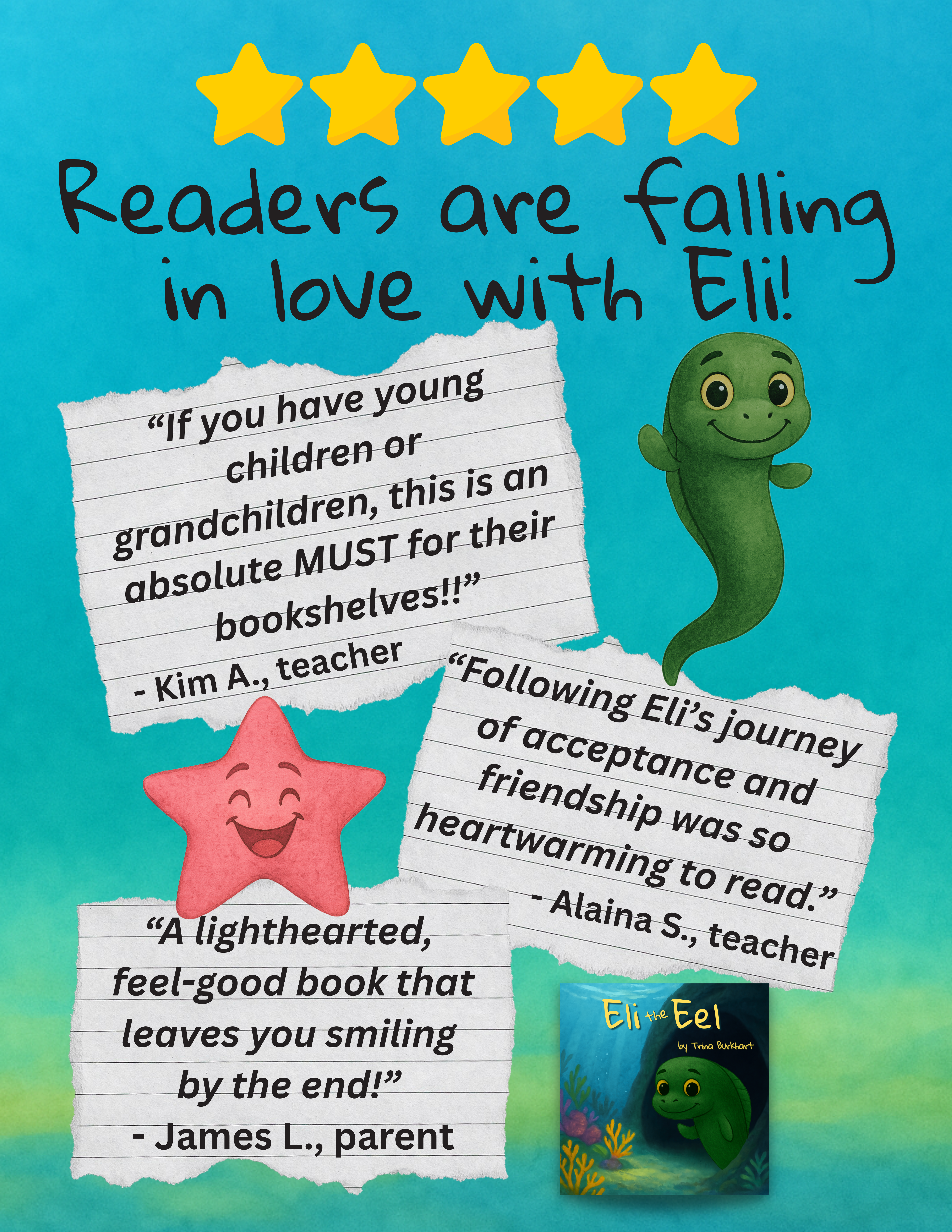 “Such an amazing read! It shows to never judge someone based on their looks. It shows that just because someone looks different doesn’t mean they aren’t a good person! Eli the Eel is an inspiration!” – Destiny H.