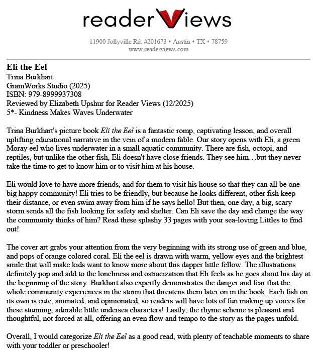 Eli the Eel was awarded a 5-Star editorial review by Reader Views, a professional book review organization. The review highlights the book’s emotional storytelling, vibrant illustrations, and read-aloud quality for young readers.